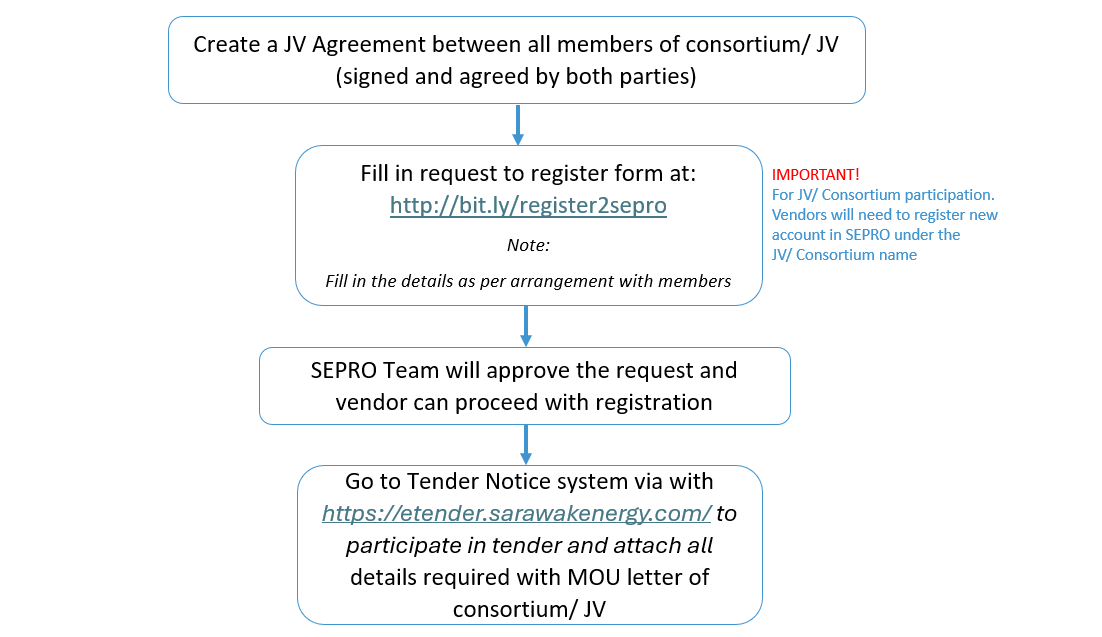 For JV/Consortium participation. Vendors will need to register new account in SEPRO under the
