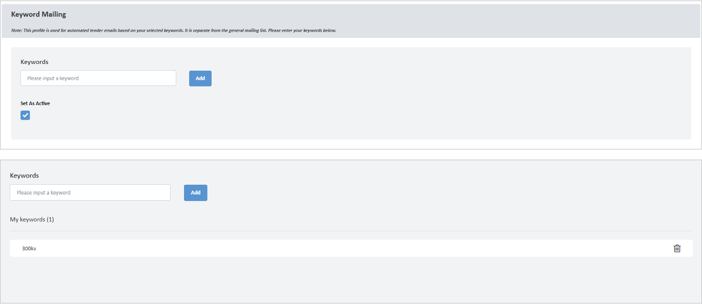 Vendors will be able to receive tender email notifications based on keyword of interest as we are introducing keyword mailing.