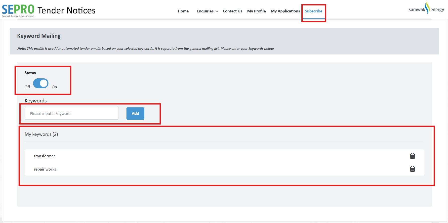Access the "Subscribe" page, look for Keyword Mailing section, make sure to turn status on and add your keywords to receive email of relevant tenders in your mailbox.